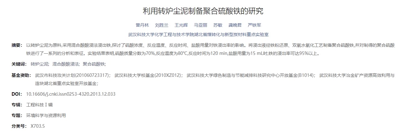 Recommended citation: 曾丹林 ;刘胜兰 ;王光辉; 马亚丽; 苏敏; 龚晚君; 严铁军,利用转炉尘泥制备聚合硫酸铁的研究.现代化工, 2013, 3(12):67-69.DOI:10.16606/j.cnki.issn0253-4320.2013.12.033.