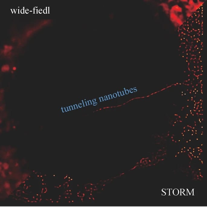As a new method of cell-cell communication, tunneling nanotubes (TNTs) play important roles in cell-cell signaling and mass exchanges. However, a lack of powerful tools to visualize dynamic TNTs with high temporal/spatial resolution restricts the exploration of their formation and cleavage, hindering the complete understanding of its mechanism. Herein, we present the first example of using stochastic optical reconstruction microscopy (STORM) to observe the tube-like structures of TNTs linking live cells with an easily prepared fluorescent dye. Because of this new imaging microscopy, the cleavage process of TNTs was observed with a high spatial resolution.