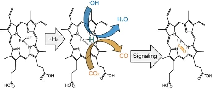 Hydrogen molecule (H2) exhibits broad-spectrum but microenvironment-dependent biomedical effects in varied oxidation stress-related diseases, but its molecular mechanism is unclear and its targeting molecule is unknown so far. Herein, we originally reveal that Fe-porphyrin is a H2-targeted molecule. We have demonstrated that the oxidized Fe-porphyrin in both free and protein-confining states can self-catalyze the hydrogenation/reduction by reacting with H2 to catalytically scavenge ·OH, and can also catalytically hydrogenate to reduce CO2 into CO in the hypoxic microenvironment of in vitro simulation and in vivo tumor, confirming that Fe-porphyrin is a redox-related biosensor of H2 and H2 is an upstream signaling molecule of CO. These discoveries are favorable for deep understanding and exploration of profound biomedical effects of H2, and helpful for development of innovative drugs and hydrogen energy/agricultural materials.